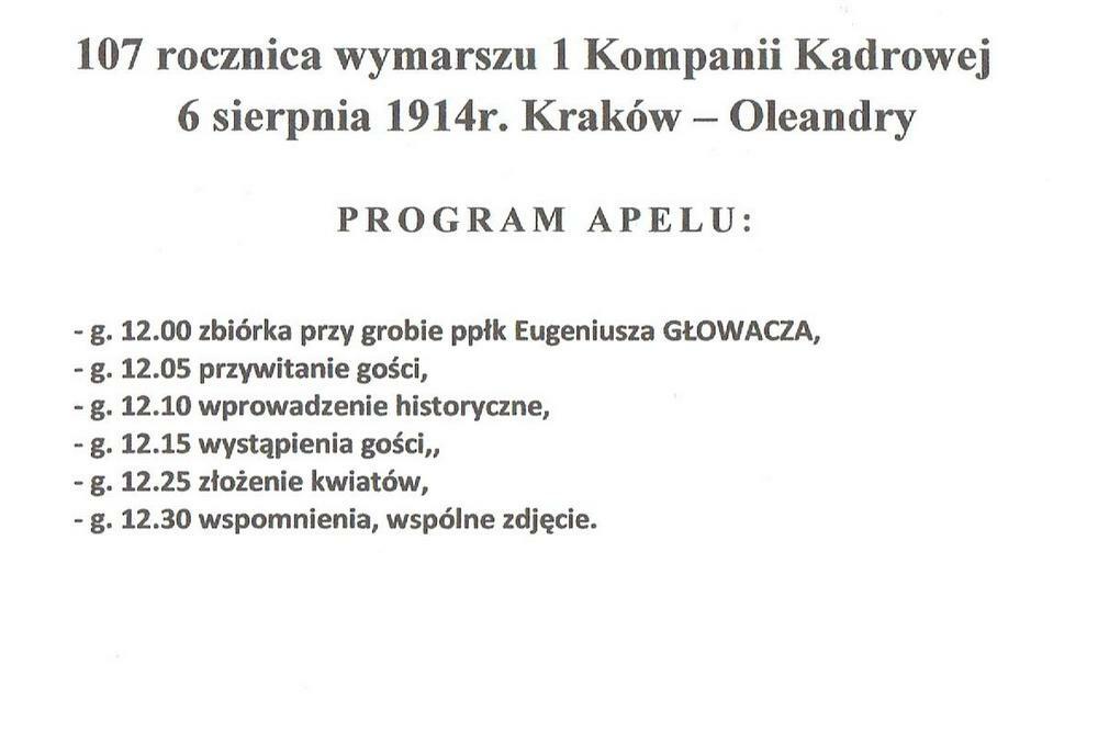 6 sierpnia 2021 r. o godz. 12:00 na cmentarzu parafialnym w Jeleniej Górze - Sobieszowie przy grobie ppłka Eugeniusza Głowacza odbędzie się uroczystość poświęcona 107. rocznicy wymarszu 1. Kompanii Kadrowej z Krakowa w kierunku Warszawy.