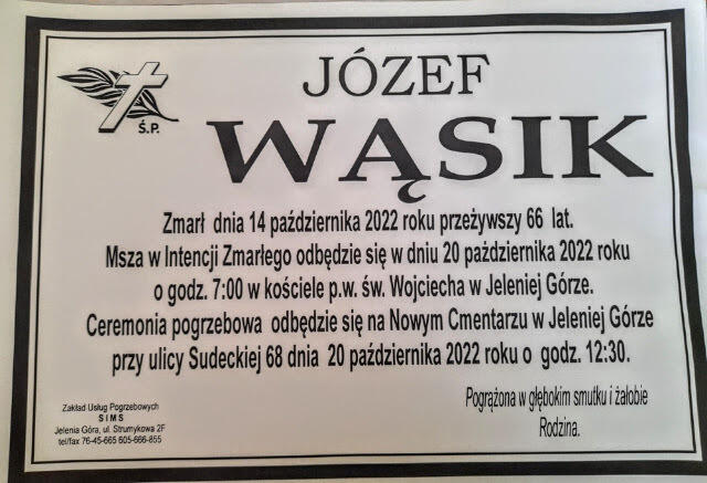 Pogrzeb odbędzie się w czwartek 20 października 2022 r.o godz.12:30 na Nowym Cmentarzu w Jeleniej Górze