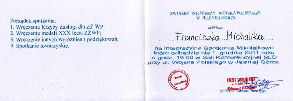 Integracyjne Spotkanie Mikołajkowe zorganizowane przez Związek Żołnierzy Wojska Polskiego w Jeleniej Górze odbyło się 1 grudnia 2011 r.