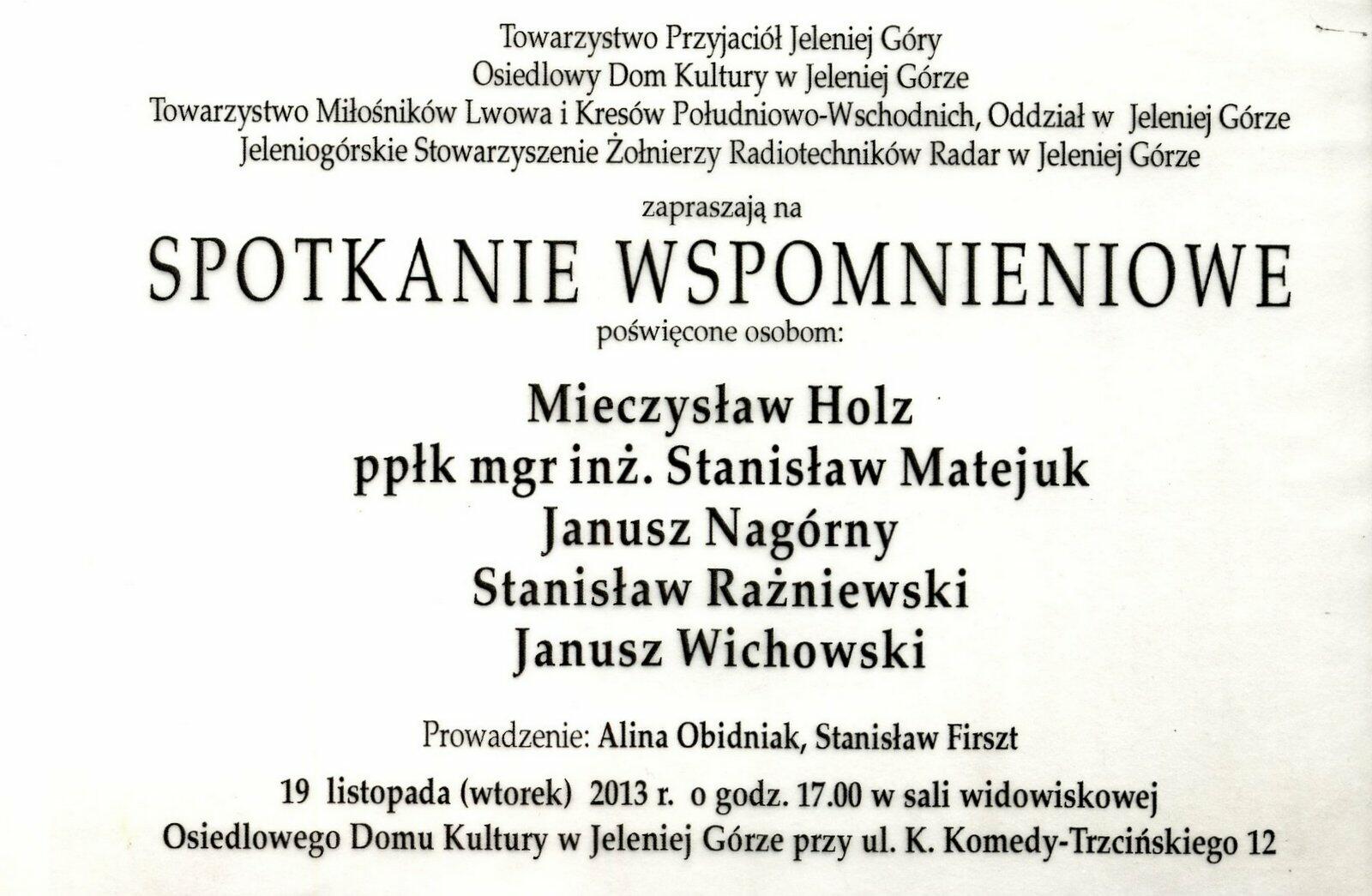 We wtorek, 19 listopada 2013 r. o godzinie 17:00, w sali widowiskowej Osiedlowego Domu Kultury w Jeleniej Górze, przy ul. K. Komedy-Trzcińskiego 12 odbyło się doroczne "Spotkanie Wspomnieniowe" poświęcone zmarłym, zasłużonym dla społeczności jeleniogórskiej.