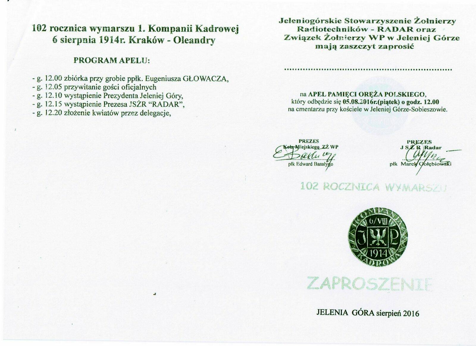W piątek 5 sierpnia 2016 r. o godz. 12:00 na cmentarzu parafialnym w Jeleniej Górze - Sobieszowie, przy grobie ppłk. Eugeniusza Głowacza, odbędą się uroczystości upamiętniające wymarsz w 1914 r. Pierwszej Kompanii Kadrowej.