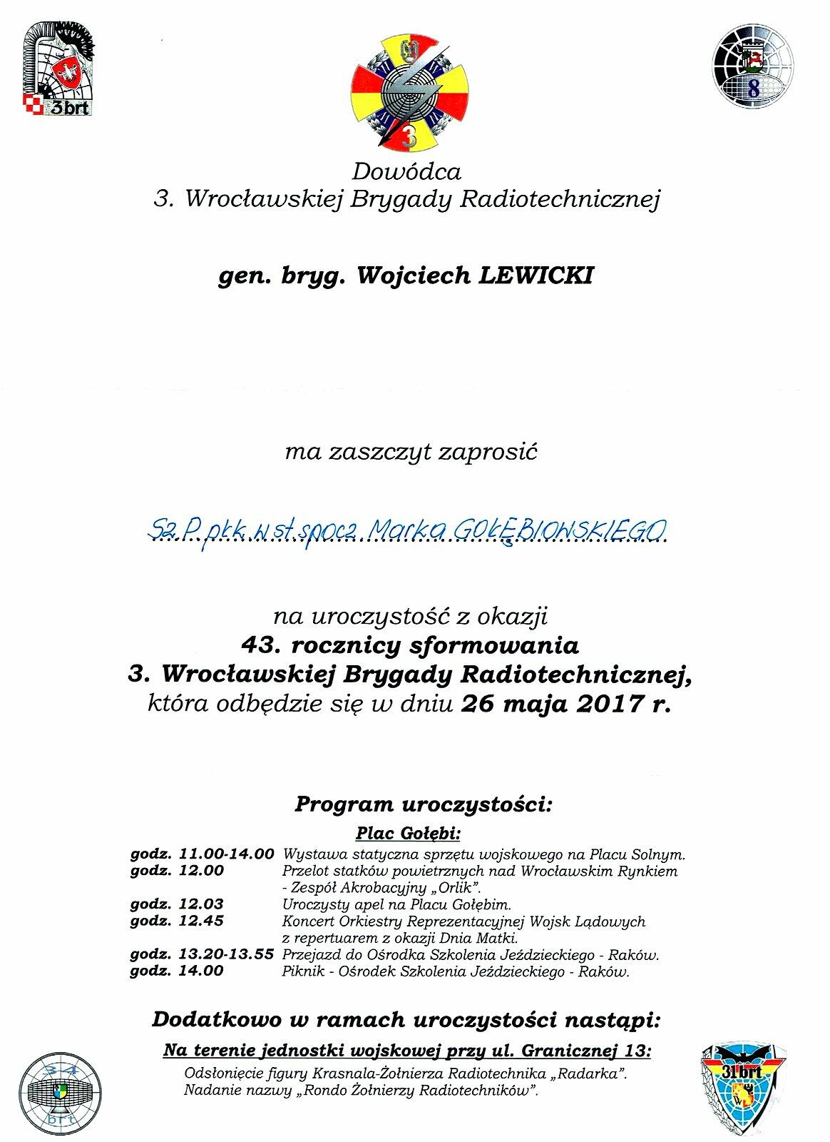 26 maja 2017 r. we Wrocławiu odbyła się uroczystość 43. rocznicy sformowania 3. Wrocławskiej Brygady Radiotechnicznej.