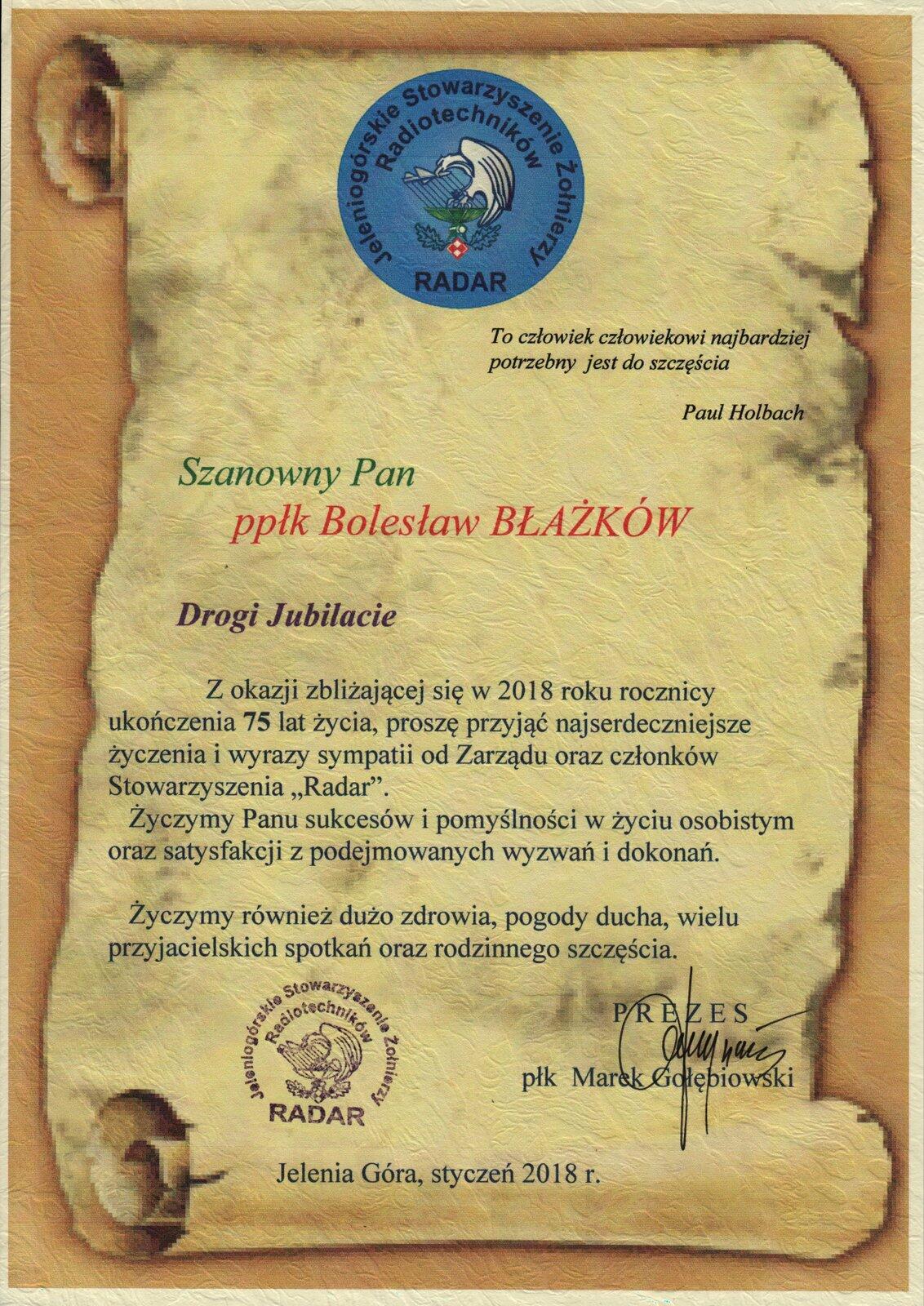 - Bogusławowi Wojdakowi - akt nadania tytułu Honorowego Członka JSŻR "Radar"