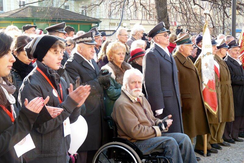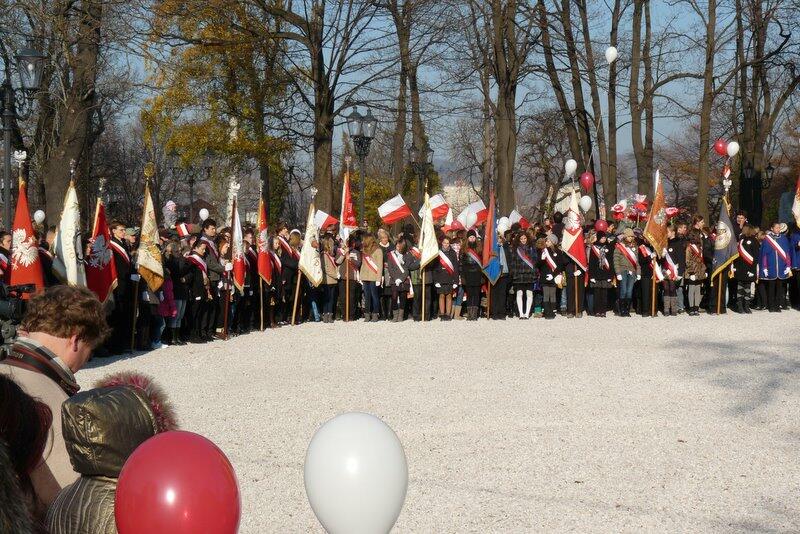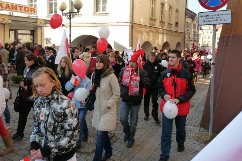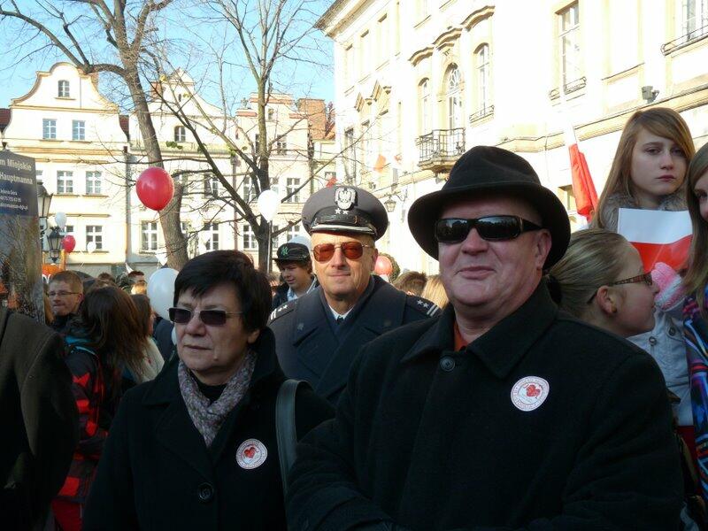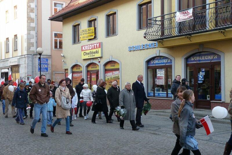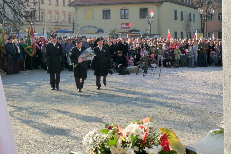 Następnie licznie zgromadzona młodzież (i nie tylko młodzież) udała się ulicą Marii Konopnickiej i ulicą 1-Maja w stronę pomnika "Niepodległość i Wolność". Tutaj już czekały poczty sztandarowe organizacji kombatanckich oraz poczty sztandarowe jeleniogórskich szkół.