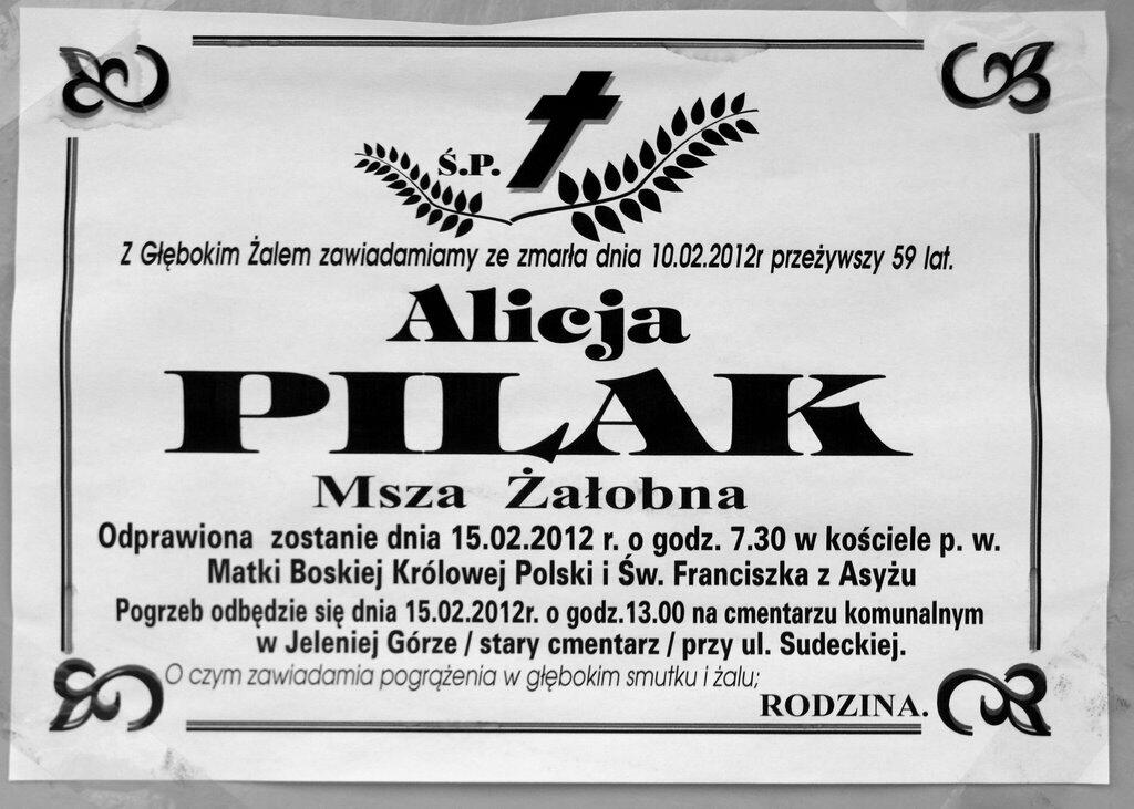 10 lutego 2012 r. zmarła śp. Alicja Pilak.