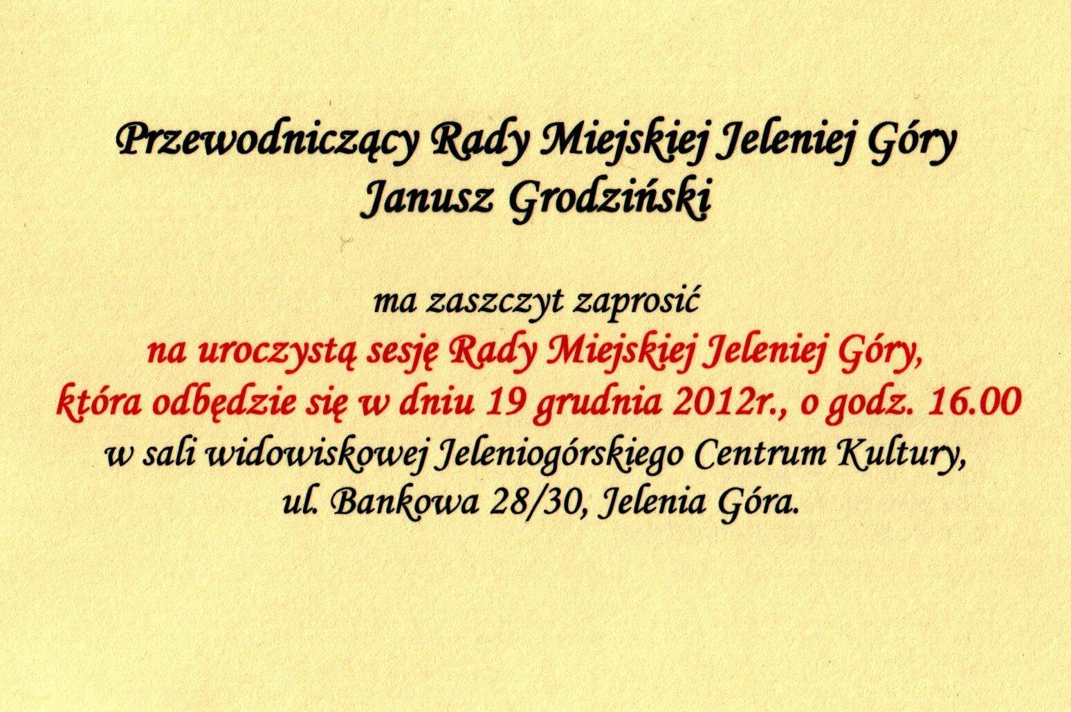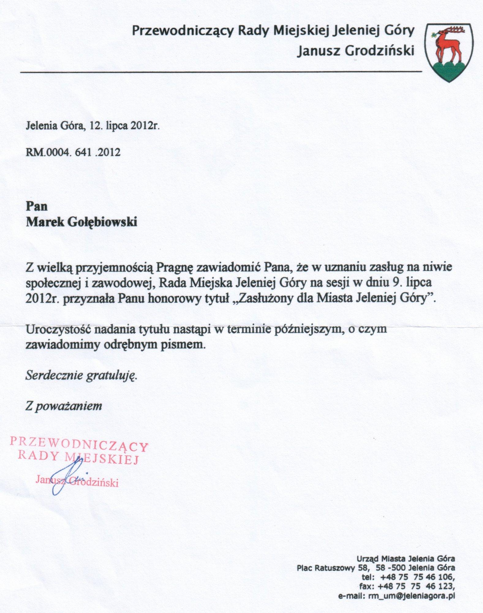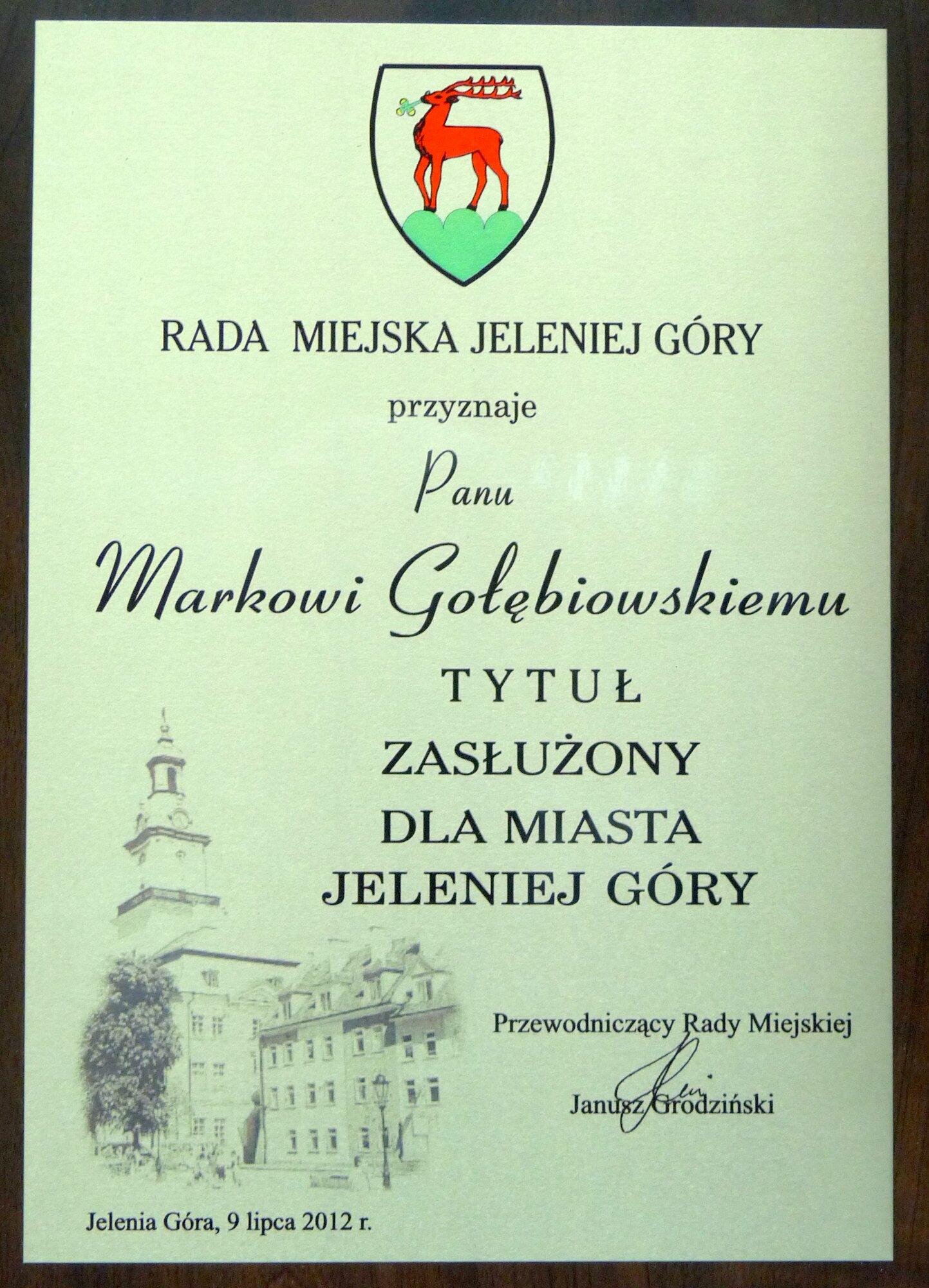 19 grudnia 2012 r. podczas uroczystej sesji Rady Miejskiej Jeleniej Góry uroczyście wręczono tytuły „Zasłużony dla Miasta Jeleniej Góry”.