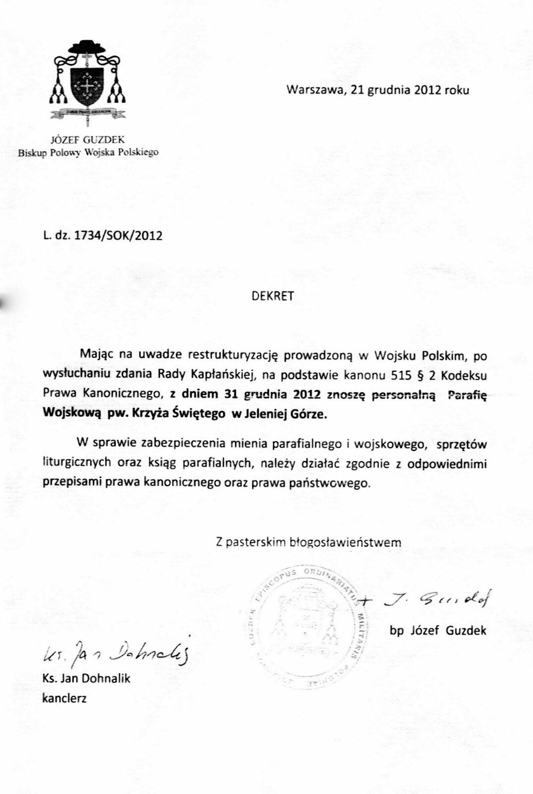 zniósł z dniem 31 grudnia 2012 r. personalną Parafię Wojskową pw. Krzyża Świętego w Jeleniej Górze.