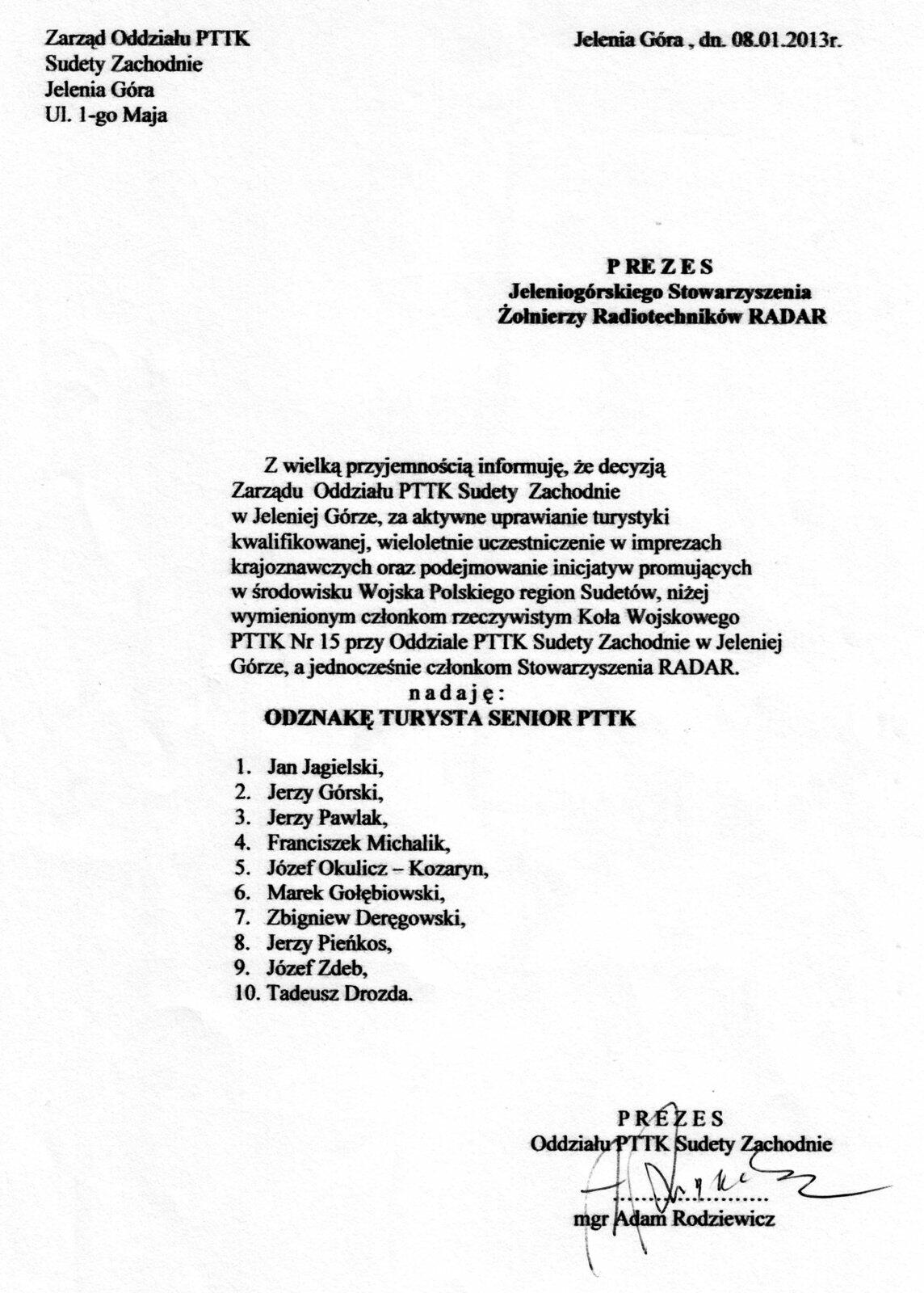 W czasie zebrania Franciszek Michalik, wiceprezes Koła Wojskowego przy Oddziale PTTK "Sudety Zachodnie", wręczył odznaki "Turysta Senior" członkom Radaru: Józefowi Okulicz-Kozarynowi oraz Jerzemu Pieńkosowi.