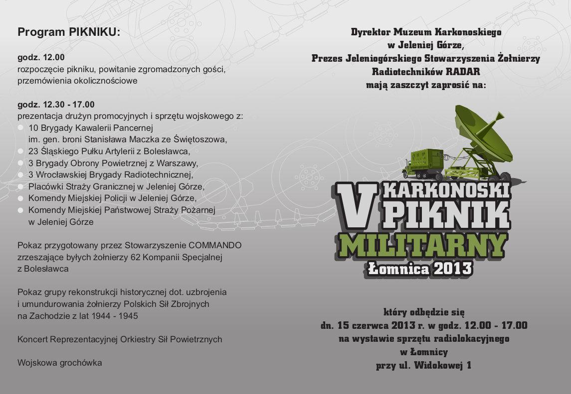 Na terenie wystawy sprzętu radiolokacyjnego w Łomnicy, w samo południe 15 czerwca 2013 r., rozpoczął się V Piknik Militarny „Łomnica 2013”. Cieszył się ogromnym zainteresowaniem mieszkańców, fanów wojska i militariów oraz turystów. Organizatorów wspomagała też pogoda, było ciepło i słonecznie przez cały dzień. Dla fanów umundurowania i sprzętu wojskowego święto w Łomnicy zdarza się raz w roku. Była okazja do spotkania z żołnierzami i obejrzenia sprzętu, także tego nowoczesnego, będącego na wyposażeniu armii.
