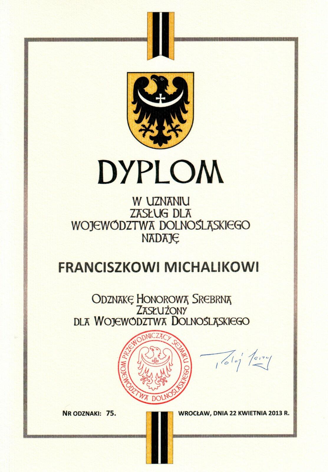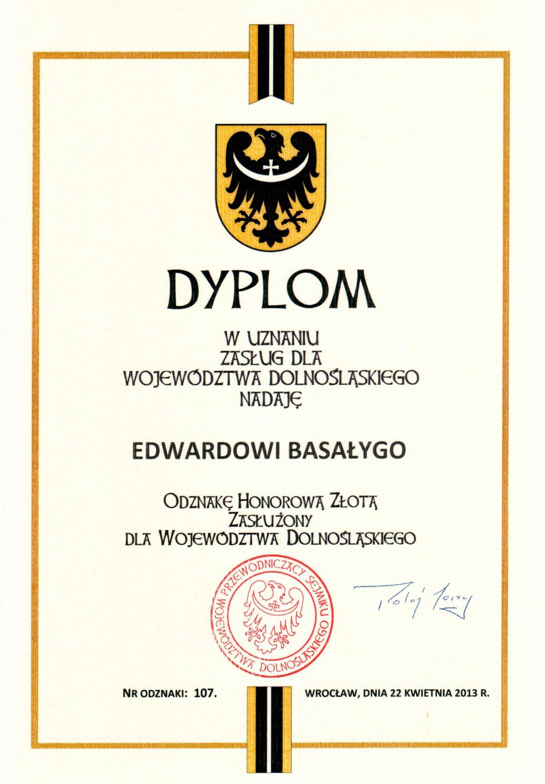 (5 czerwca 2013 r. - podczas zebrania JSŻR Radar - Złote Honorowe Odznaki "Zasłużony dla Wojewdztwa Dolnośląskiego" otrzymali: