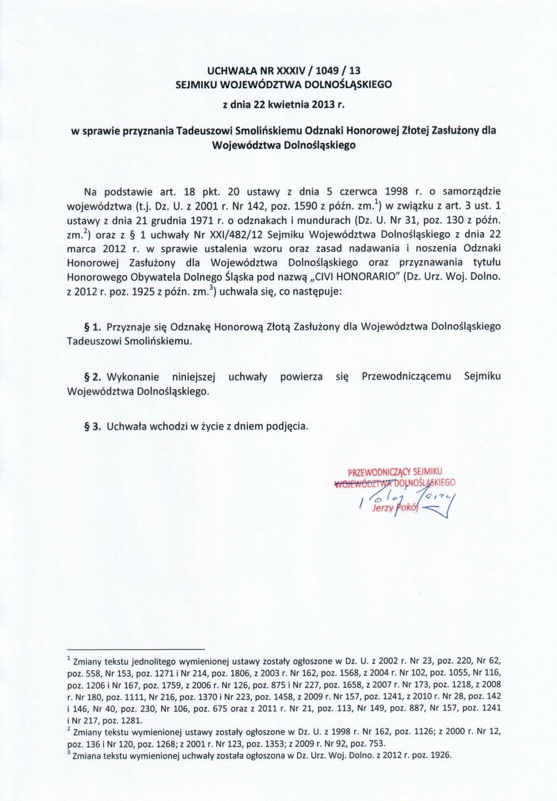 Po krótkim powitaniu wicemarszałek Jerzy Łużniak odczytał uchwałę Sejmiku Dolnośląskiego o wyróżnieniu 8 byłych żołnierzy zawodowych Honorowymi Odznakami „Zasłużony dla Województwa Dolnośląskiego".