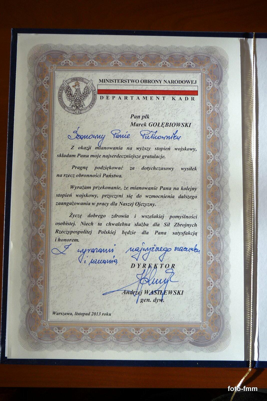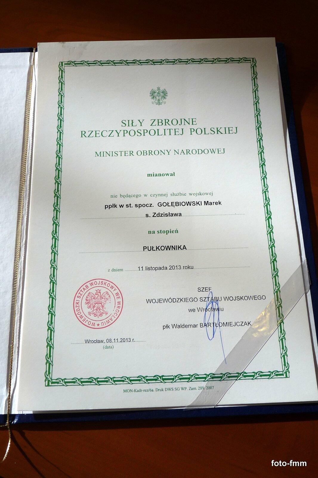 Przed występami żołnierzy z Wrocławia Zastępca Rektora-Komendanta ds. Wojskowych Wyższej Szkoły Oficerskiej Wojsk Lądowych płk dr Piotr Pertek wręczył Prezesowi JSŻR "Radar"ppłk. w st. spocz. Markowi Gołębiowskiemu akt mianowania na stopień pułkownika.