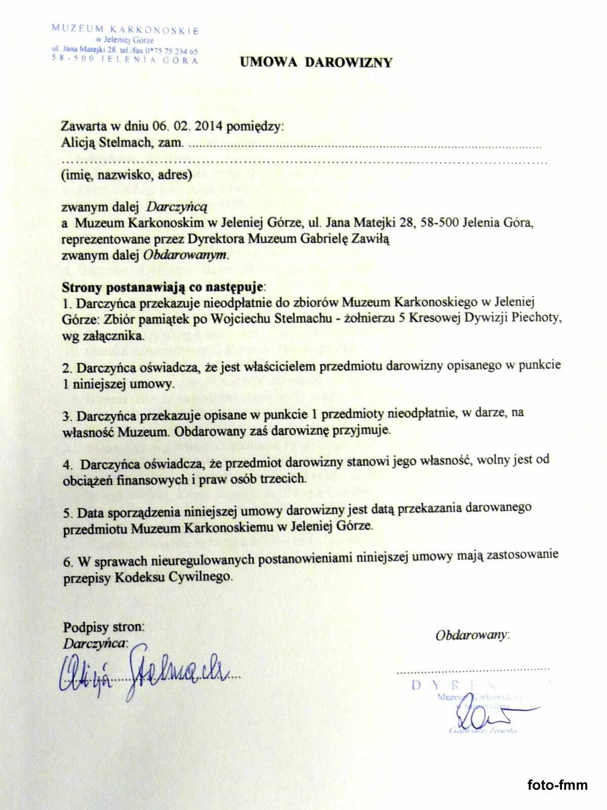 6 lutego 2014 roku Pani Alicja Stelmach przekazała do Muzeum Karkonoskiego w Jeleniej Górze zbiór pamiątek po swoim Ojcu Wojciechu Stelmachu - żołnierzu 5 Kresowej Dywizji Piechoty.