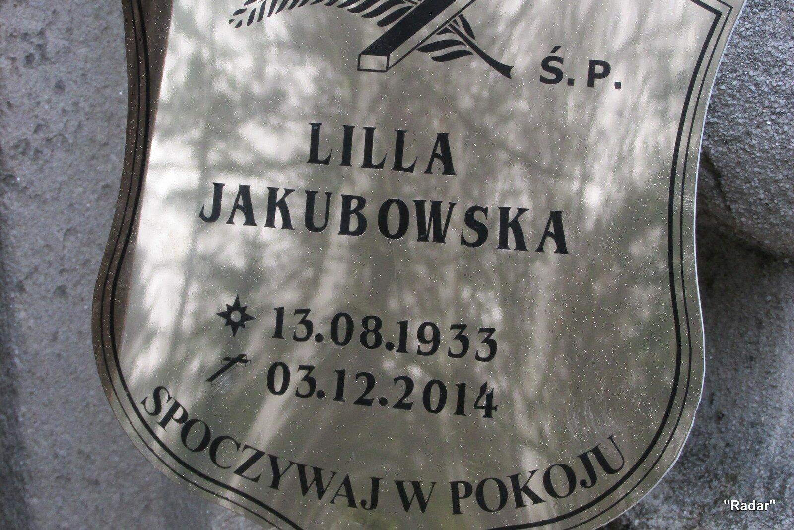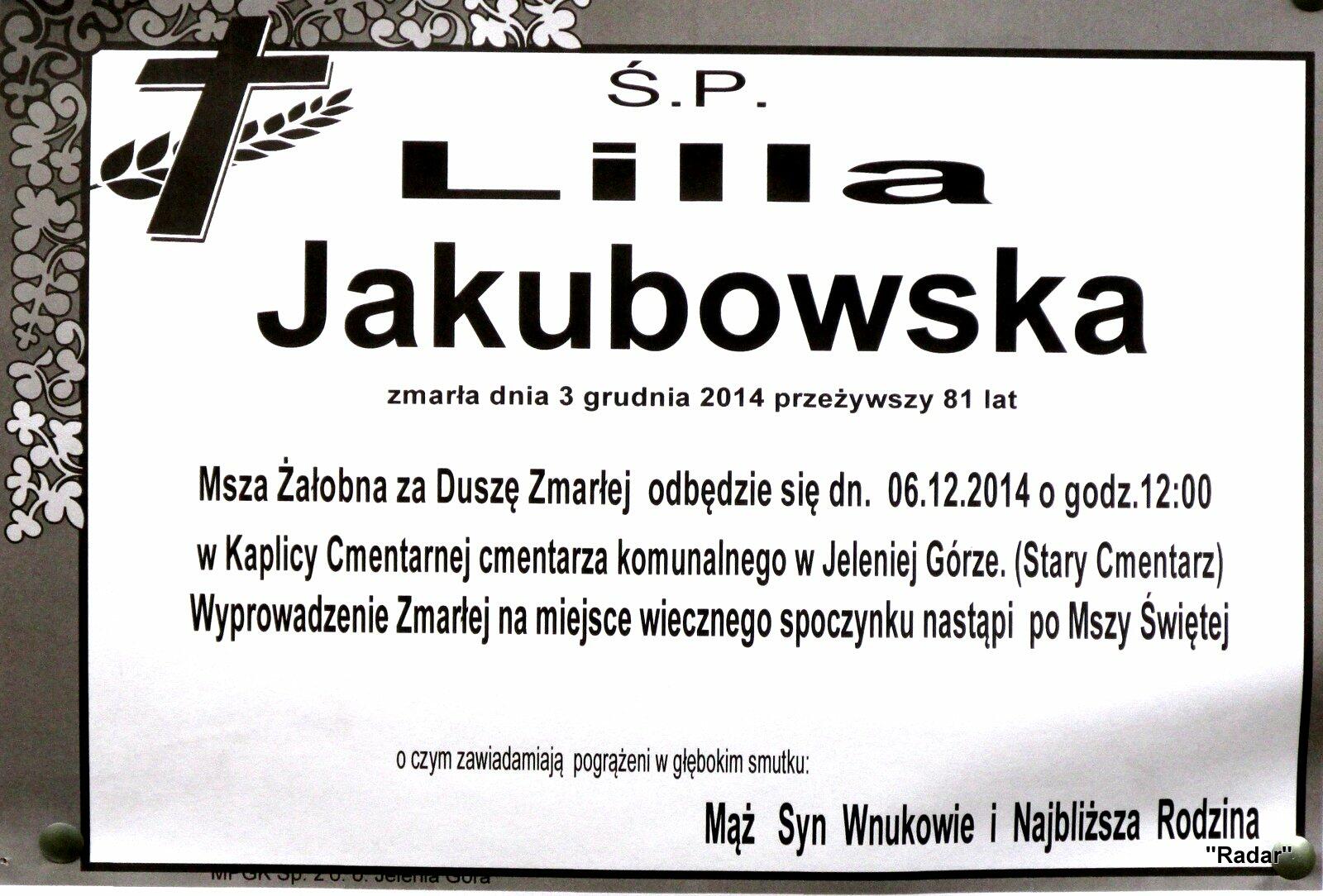 3 grudnia 2014 r. zmarła Lilla Jakubowska - żona płka w st.spocz. Edwarda Jakubowskiego - prezesa Zarządu Okręgowego Związku Kombatantów RP i BWP w Jeleniej Górze.