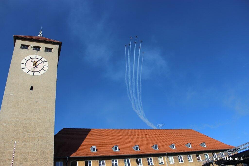 Uroczysty apel rozpoczął meldunek Dowódcy uroczystości kpt. Pawła Ziń złożony Inspektorowi Sił Powietrznych Dowództwa Generalnego Rodzajów Sił Zbrojnych gen. dyw. pil. Janowi ŚLIWCE. Tuż po meldunku nad głowami licznie zgromadzonych gości i mieszkańców Szczytna zaprezentował się Zespół Akrobacyjny „ORLIK” w składzie 8 samolotów PZL – 130 Orlik. Zespół wykonał lot z lotniska w Radomiu, następnie zaprezentował pokaz i powrócił na macierzyste lotnisko.