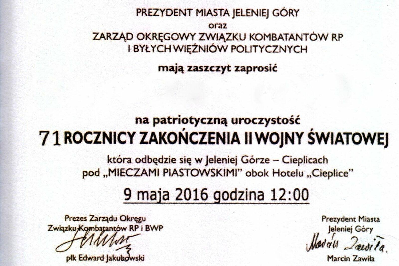W poniedziałek 9 maja 2016 r. w Jeleniej Górze - Cieplicach pod "Piastowskimi Mieczami" odbyły się uroczystości związane z 71 rocznicą zakończenia II wojny światowej w Europie.