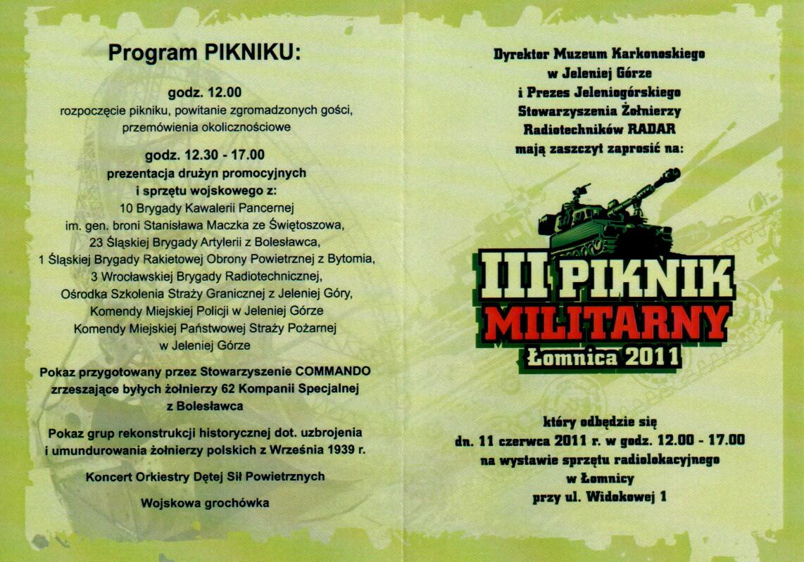 W dniu 11 czerwca 2011 r. w godz.12.00 - 17.00 w "Muzeum Radarów" w Łomnicy koło Jeleniej Góry odbył sie III Piknik Militarny organizowany wspólnie przez Stowarzyszenie "Radar" i Muzeum Karkonoskie w Jeleniej Górze.