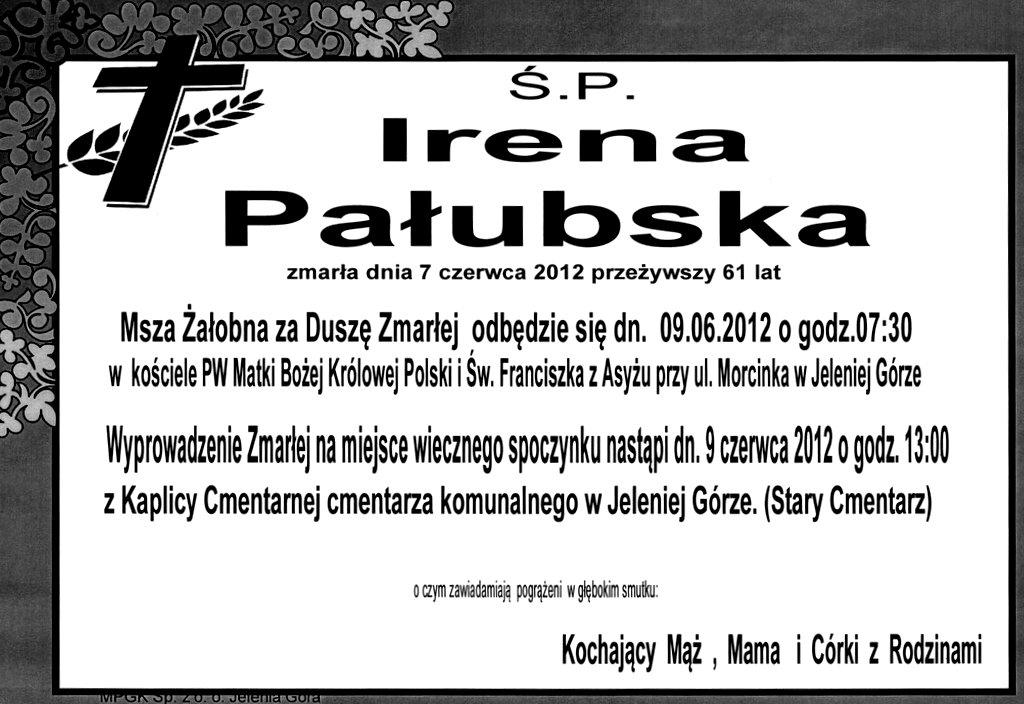 9 czerwca 2012 r. na Starym Cmentarzu w Jeleniej Górze pożegnaliśmy śp. Irenę Pałubską.