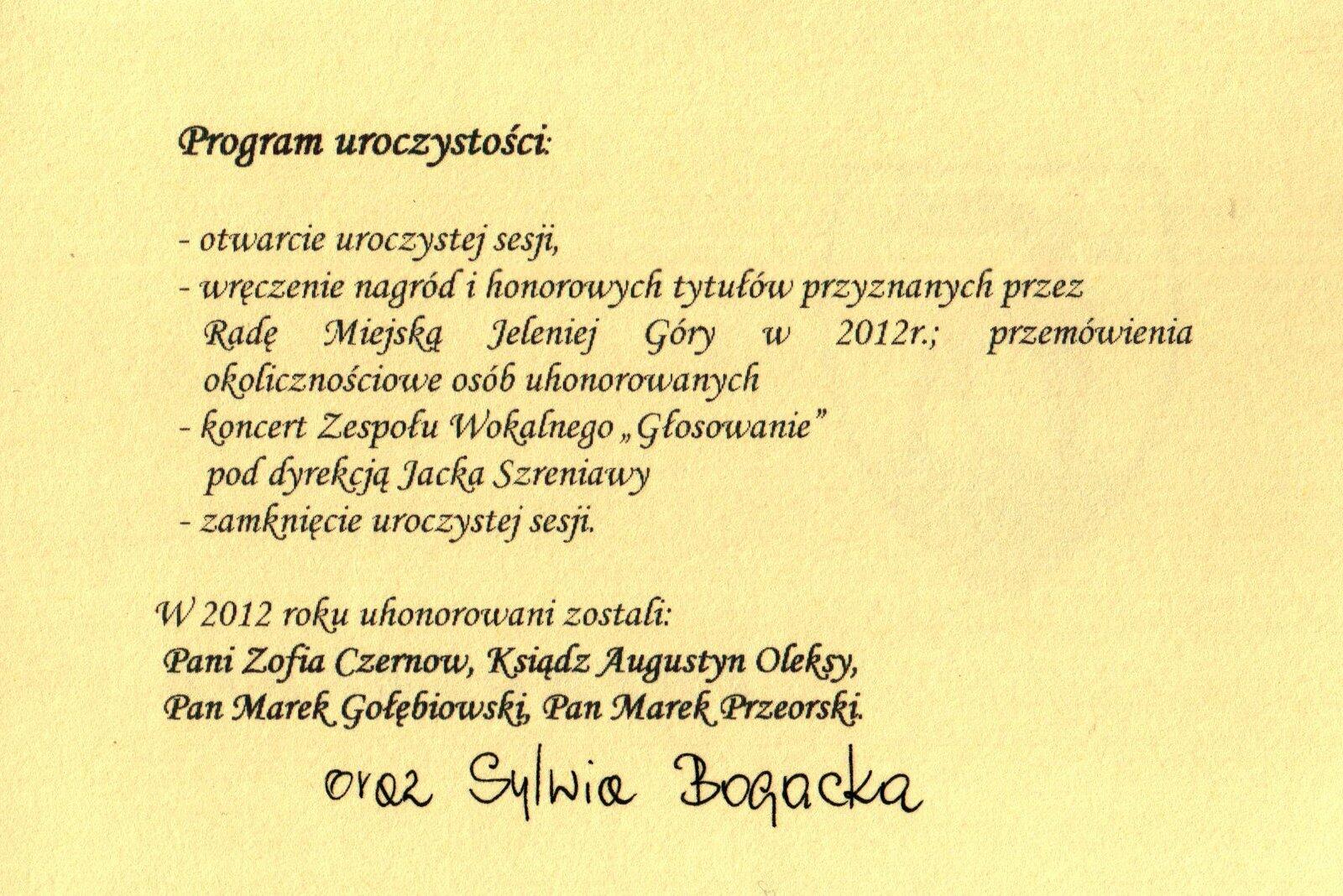 19 grudnia 2012 r. podczas uroczystej sesji Rady Miejskiej Jeleniej Góry uroczyście wręczono tytuły „Zasłużony dla Miasta Jeleniej Góry”.