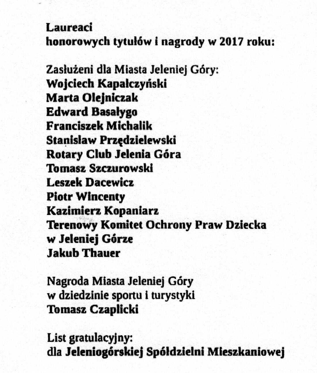 27 września 2017 r. w sali koncertowej Filharmonii Dolnośląskiej w Jeleniej Górze odbyła się Uroczysta Sesja Rady Miejskiej Jeleniej Góry poświęcona wręczeniu Honorowych Tytułów "Zasłużony dla Miasta Jeleniej Góry".