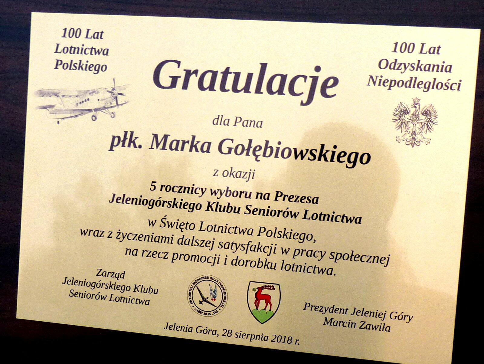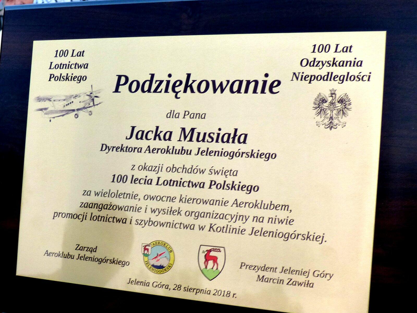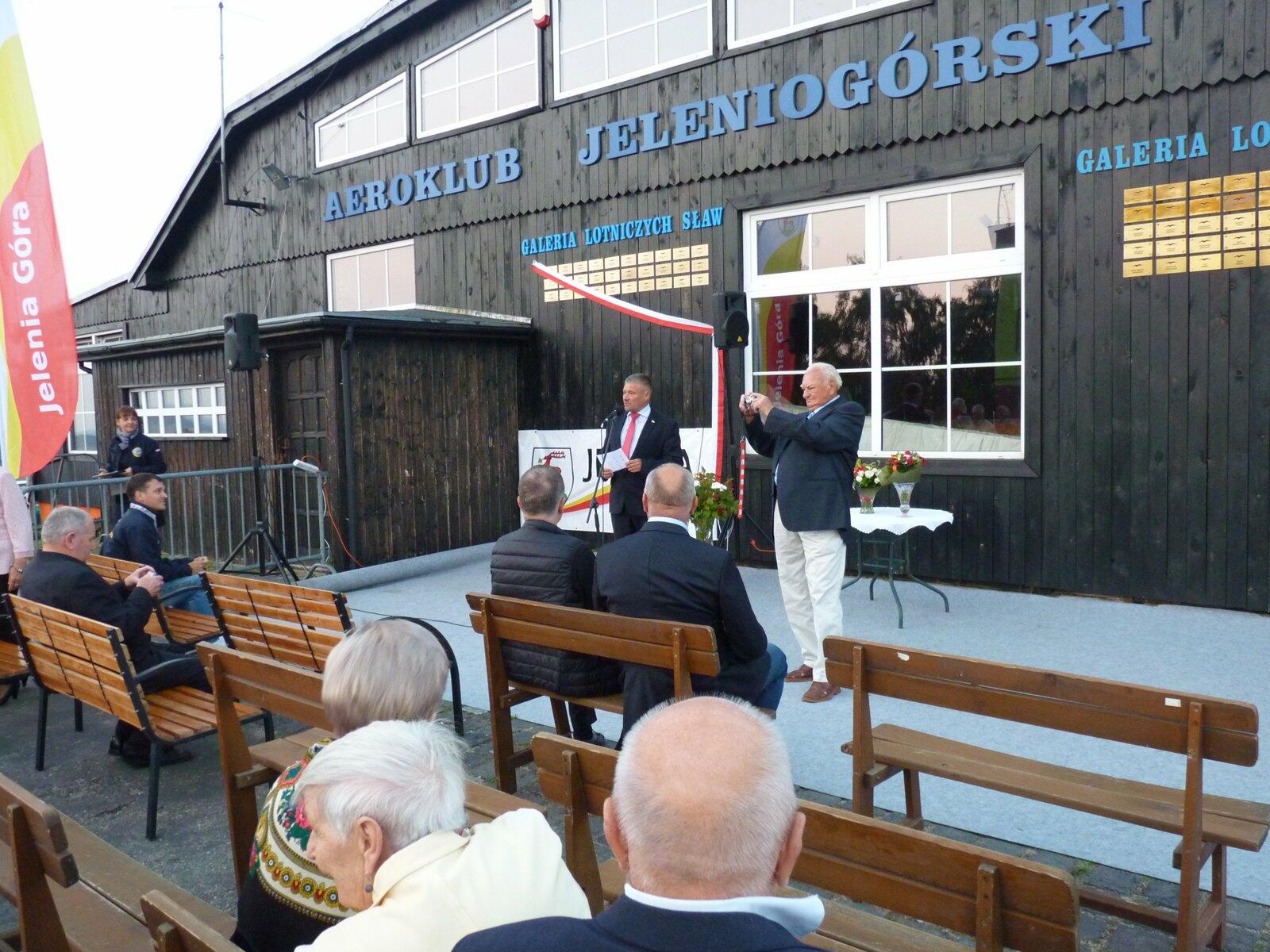 - O godz. 19:30 w Galerii Sław Lotniczych na Górze Szybowcowej w Jeżowie Sudeckim odsłonięto kolejne tabliczki z nazwiskami wybitnych ludzi lotnictwa. Jacek Musiał - dyrektor Aeroklubu Jeleniogórskiego oraz Marek Gołębiowski prezes Jeleniogórskiego Klubu Seniorów Lotnictwa otrzymali od Prezydenta Jeleniej Góry Marcina Zawiły okolicznościowe podziękowania. Podziękowania wręczył zastępca prezydenta Jeleniej Góry Piotr Paczóski.